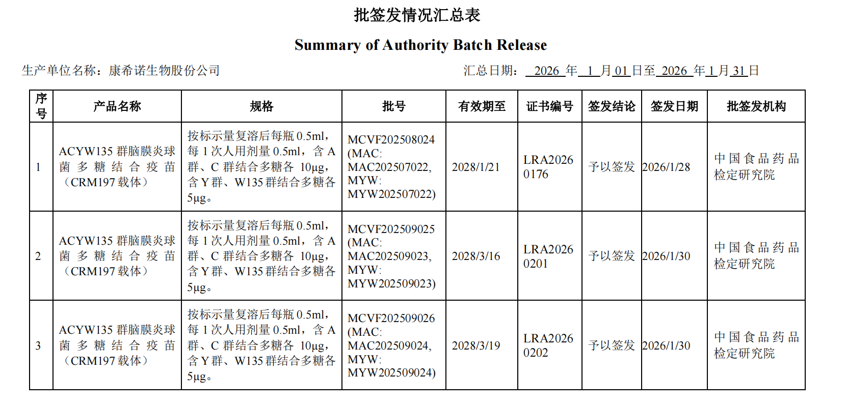 2026年1月份产品批签发信息